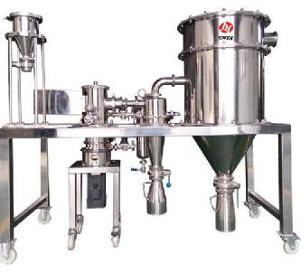 本机主要有粉碎机、筛粉机、旋风分离器、除尘布袋,操作平台、电器控制箱等部分组成。原料首先经过除铁器进入粉碎机,粉碎后由风送到分离器,经过分离器出料口进入筛粉机入料口,由筛粉机主轴带动绞龙自动喂料,同时带动导向推板将粉末推进,细粉经过筛网落入布袋,粗粉返回粉碎机内再粉碎。